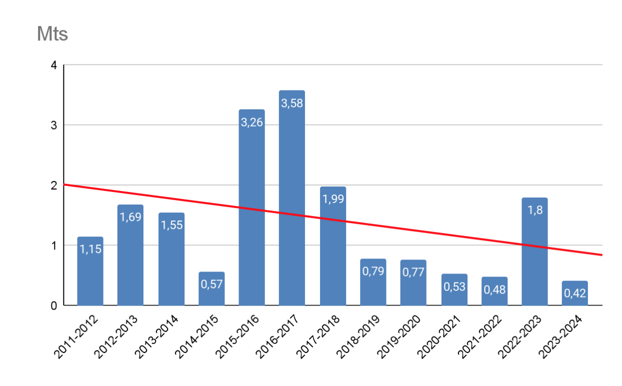 Como se observa en el gráfico, las temporadas 2018-2019, 2019-2020, 2020-2021 y 2021-2022 presentaron un promedio de sólo 0,6 metros de acumulación de nieve; la temporada 2022-2023, sale de la tendencia, siendo un año con mayor acumulación de precipitaciones. La temporada 2023-2024 tuvo el peor registro en los últimos 13 años.