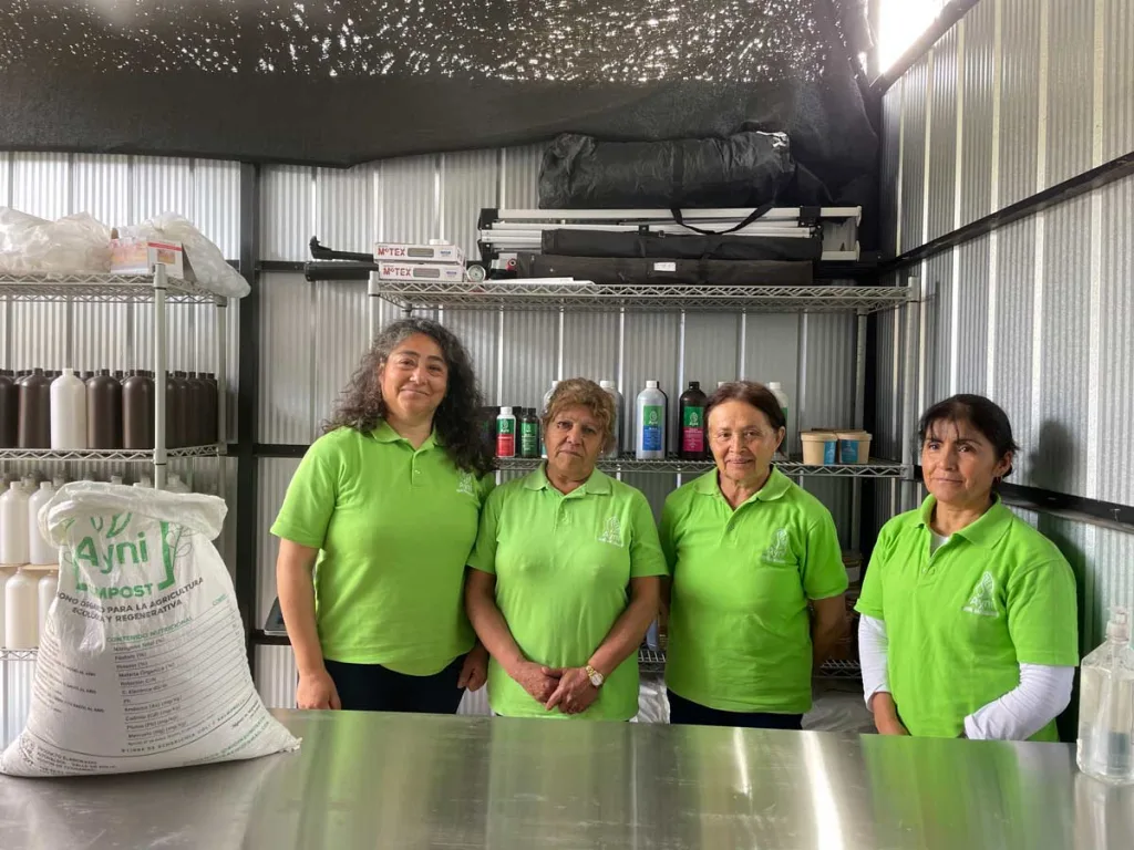 Las mujeres de Ayni trabajan de manera colaborativa: cada una produce su compost, materia orgánica líquida (MOL), Bocachi, humus de lombriz, entre otros productos, todos bajo el mismo estándar de calidad. Estos productos son probados en la unidad productiva de Marta, que se utiliza como parcela demostrativa y de validación de los bioinsumos como los resultados en la producción de hortalizas libre de agroquímicos y además cuenta con un laboratorio para analizarlos.